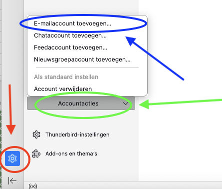 Stap 1: Open Thunderbird, klik linksonder op het tandwieltje, klik daarna op 'Accountacties'.