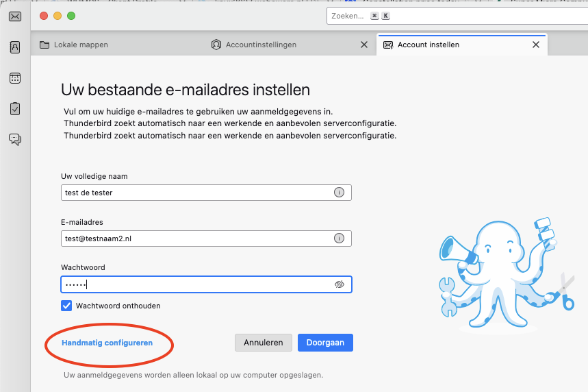 Stap 3: Omdat het Thunderbird niet is gelukt om de juiste instellingen op de server te vinden, vullen we deze hier handmatig in.