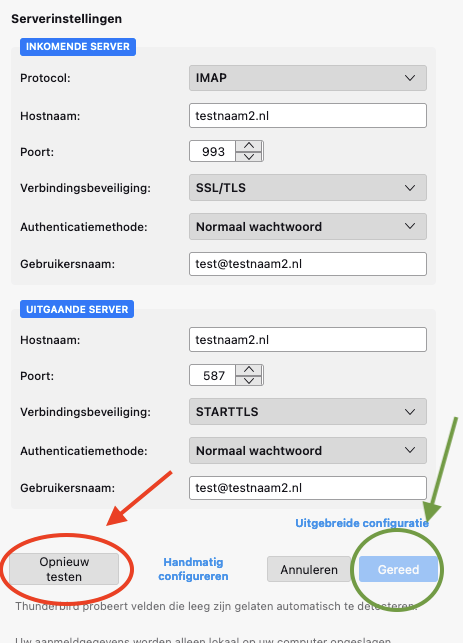 In vrijwel alle gevallen krijg je nu een groene melding te zien met de tekst 'Configuratie gevonden bij e-mailprovider', in dat geval kan je op 'Gereed' klikken en ben je al klaar.