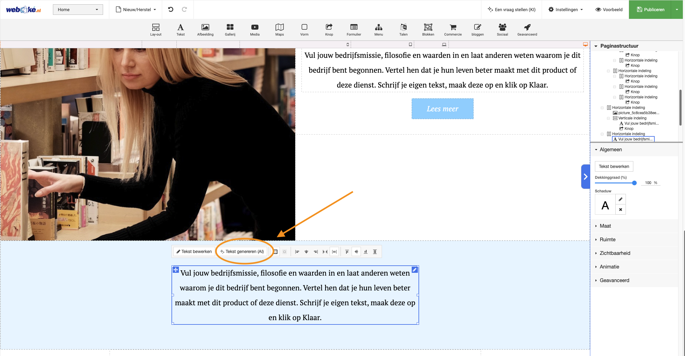 Zodra de website is gegenereerd, zie je een opzet met een stijl die past bij je ingevulde bedrijfsnaam. De website bevat placeholder teksten die je eenvoudig kunt aanpassen. Klik op een tekstblok en selecteer Tekst genereren.