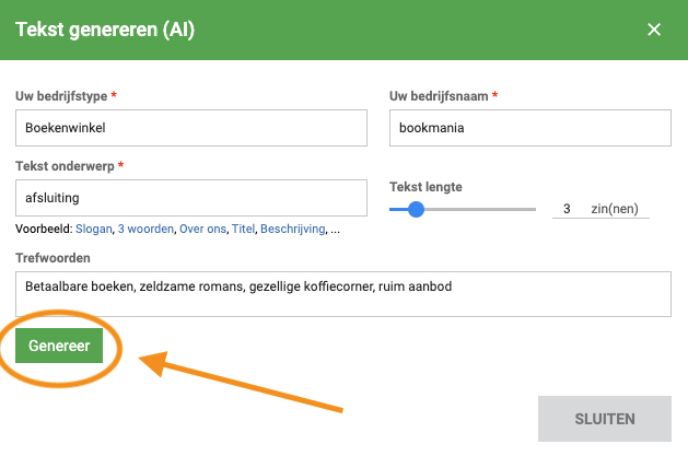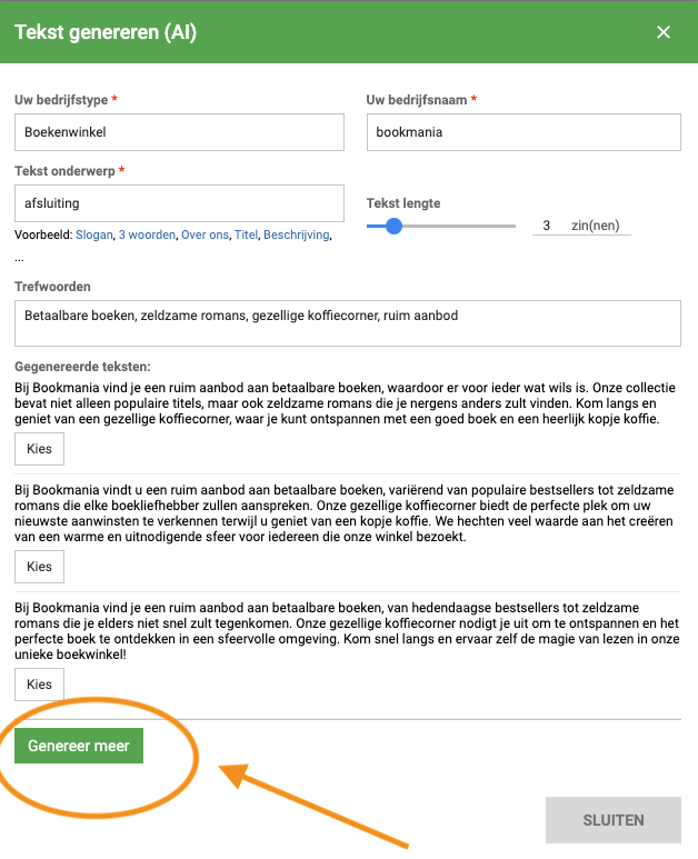 Vul enkele trefwoorden in, zoals "betaalbare boeken," "zeldzame romans," "gezellige coffee corner," en "ruim aanbod." Kies vervolgens de gewenste tekstlengte, bijvoorbeeld vijf zinnen.