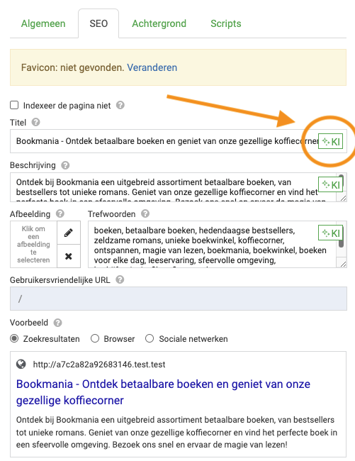 Zorg dat de juiste pagina (bijvoorbeeld de homepage) open staat en klik op SEO. Hier vind je de KI-knop (wordt vervangen door AI), waarmee je automatisch een SEO-vriendelijke titel kunt genereren. Doe hetzelfde voor de beschrijving en optioneel de trefwoorden, al zijn die laatste tegenwoordig niet zo belangrijk meer. De AI-assistant houdt rekening met de juiste SEO richtlijnen en maakt pakkende teksten die een grote kans hebben overgenomen te worden door zoekmachines.