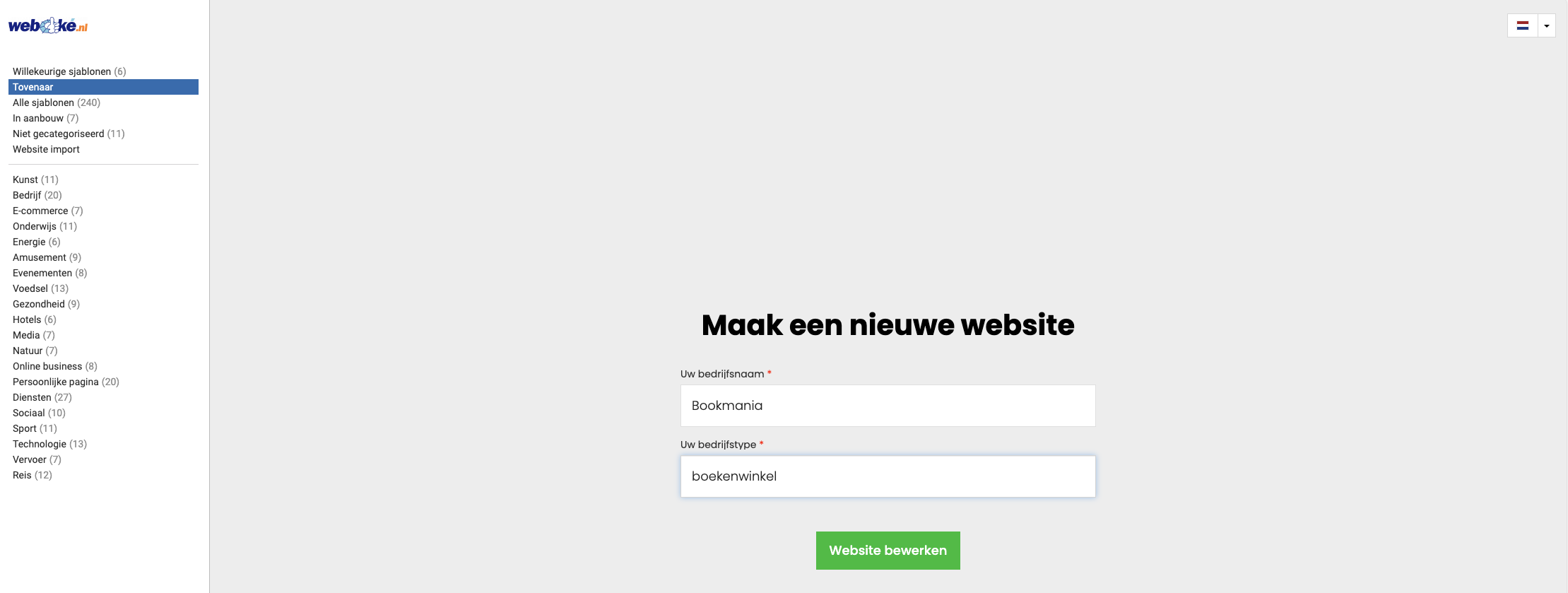 Als je bijvoorbeeld, als je een boekenwinkel hebt met de naam "Bookmania," vul je dat hier in. Klik vervolgens op Website bewerken. Het genereren van de website duurt 1 à 2 minuten.