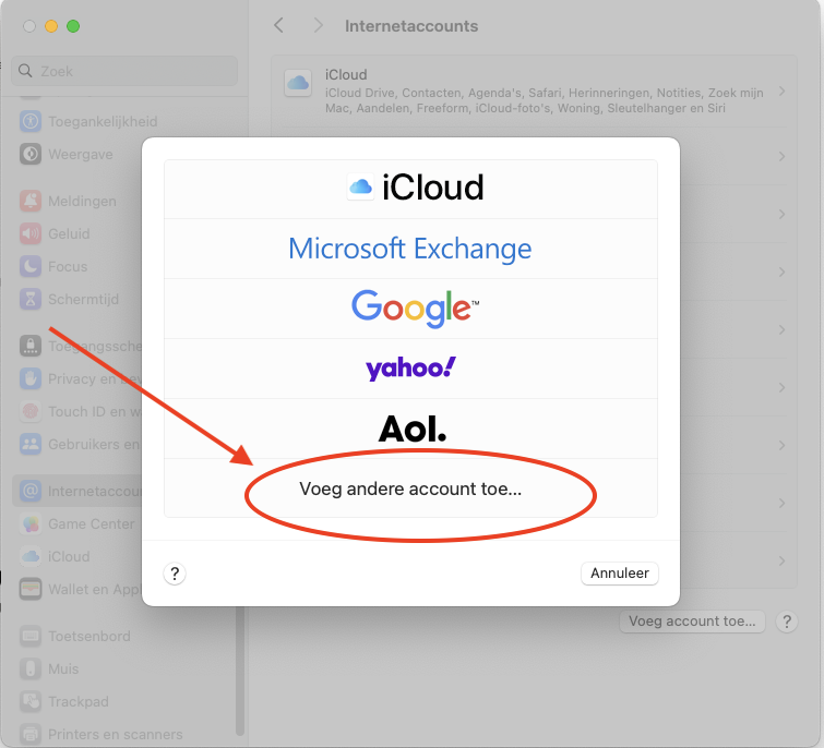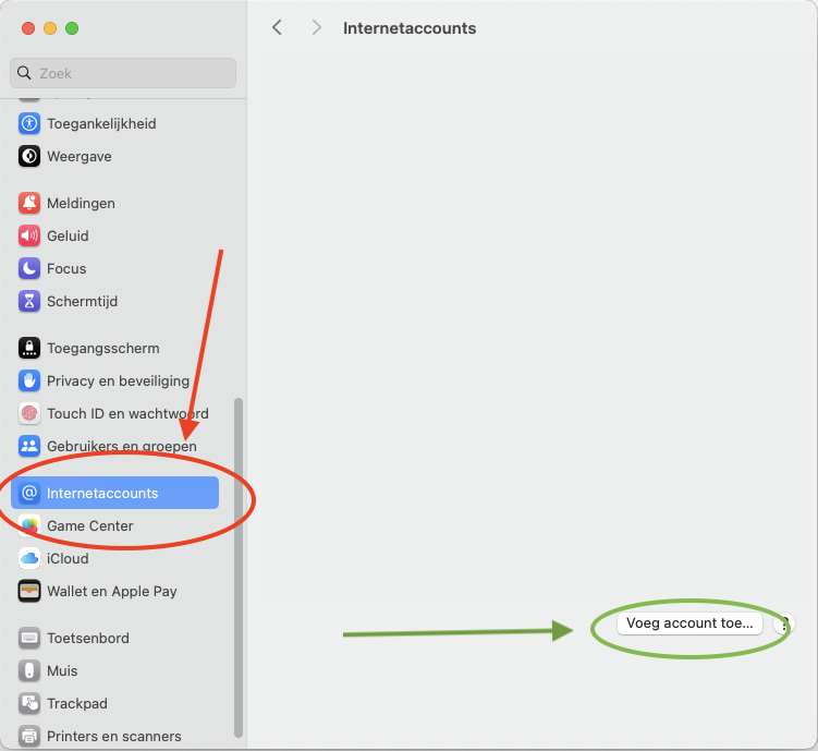 Stap 1: Open de instellingen van je Mac en open het menu ''Internetaccounts', klik daarna op 'Voeg account toe...'.