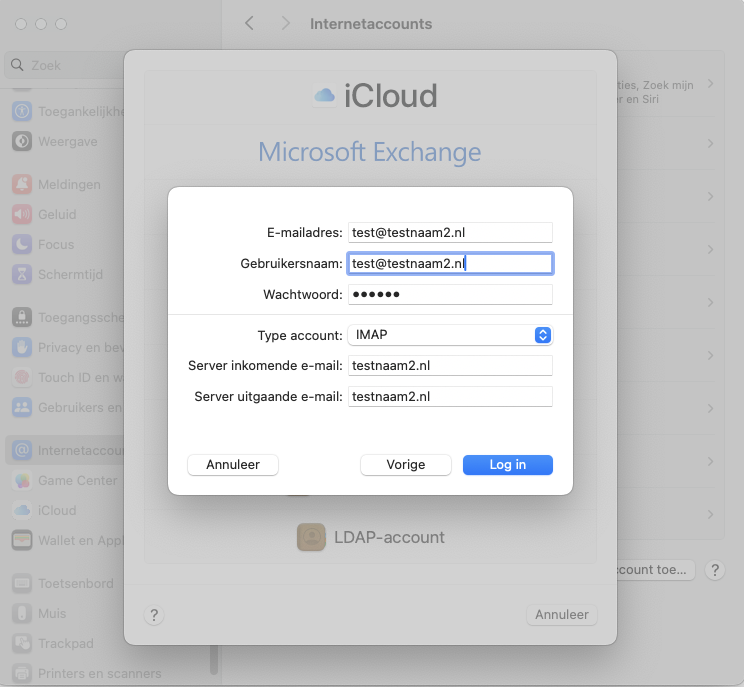 Server inkomende- en uitgaande e-mail: Dit is je domeinnaam, in dit voorbeeld is dat dus testnaam2.nl. Soms staat hier je domeinnaam ingevuld met IMAP of SMTP ervoor, dat kan je verwijderen, alleen de domeinnaam is voldoende.
