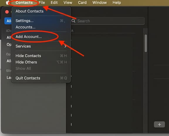 Step 2 - Open the Contacts app on your Mac. Click on 'Contacts' in the menu bar at the top left and then on 'Add Account...'.