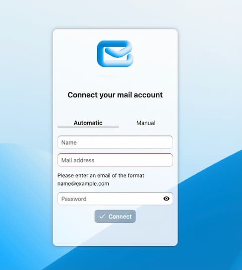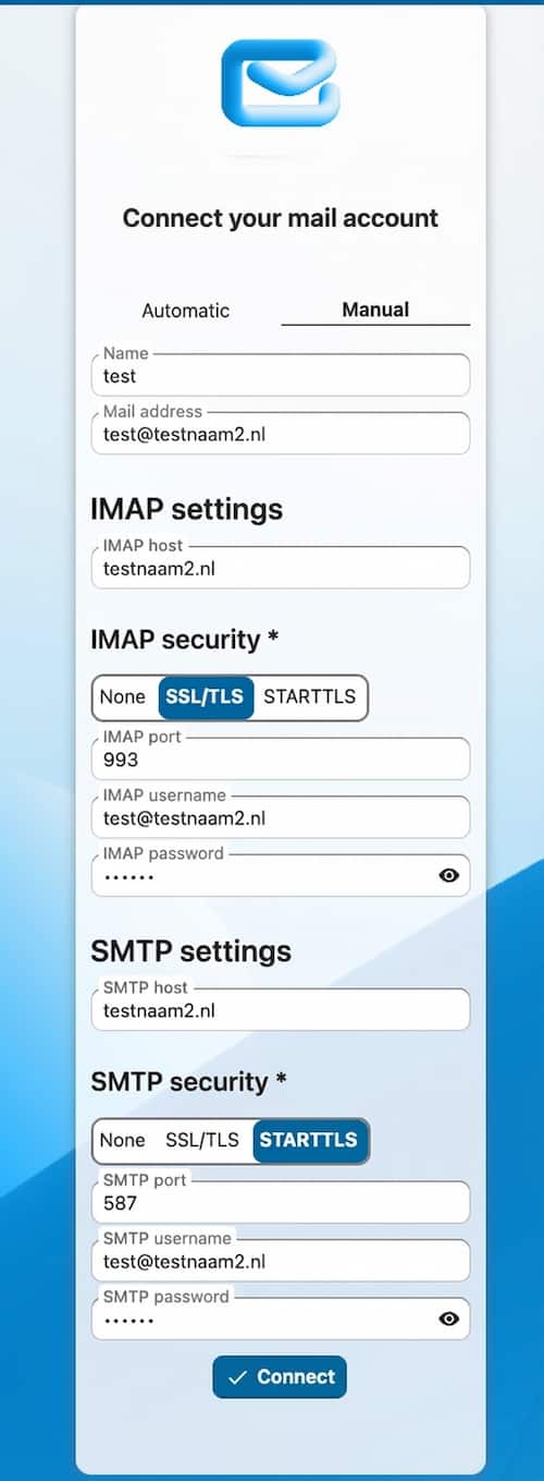 Pour la plupart des boîtes aux lettres WebOké, cela fonctionne immédiatement et vous avez terminé. Si certains paramètres (DNS) ne sont pas standard, choisissez 'Manual'. Dans le reste de l'article, nous expliquons comment ajouter la boîte aux lettres manuellement.