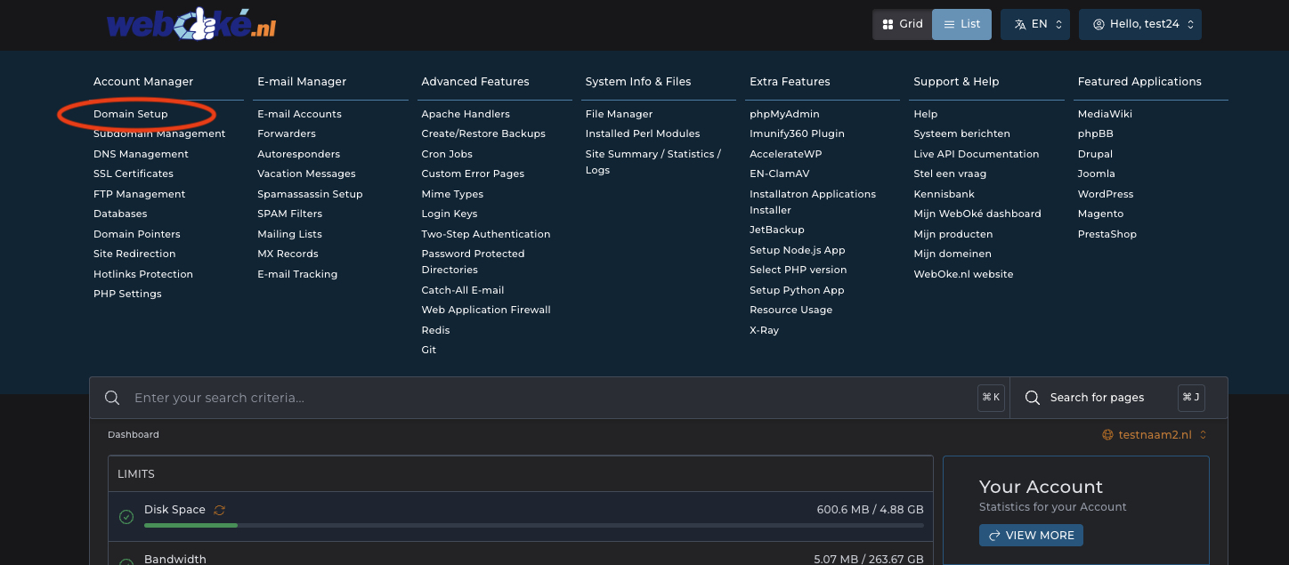Schritt 1 - Gehen Sie auf WebOke.nl zu Meine Produkte und klicken Sie auf 'DirectAdmin Kontrollpanel öffnen'